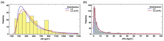Histograms and theoretical distributions (lognormal (Ln) and lognormal three-parameter (Ln 3-P)) of the abundances of Ni ((a): aNi) and Pb ((b): aPb) for sets used to validate the prediction quality (combined training and testing datasets) (Figure 11).