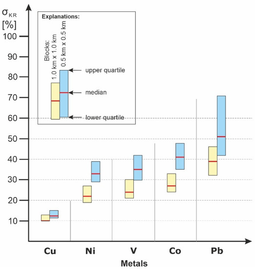The average abundance of the accompanying elements is estimated, in comparison to the abundance of the basic Cu element, with much less accuracy. The medians of errors of the Ni, V, and Co abundance estimation are roughly 2–3 times and in the case of ×the abundance of Pb 4–5 times greater than the medians of the estimates of the abundance of Cu, which are of the order of 10–12% (Table 6). It is also seen in Figure 13 that the estimation kriging error (σKR) decreases as the estimation surface area increases, a well-known result established by Krige [52,53] and demonstrated by Matheron [54,55] using the dispersion variance expressed in function of the variogram.