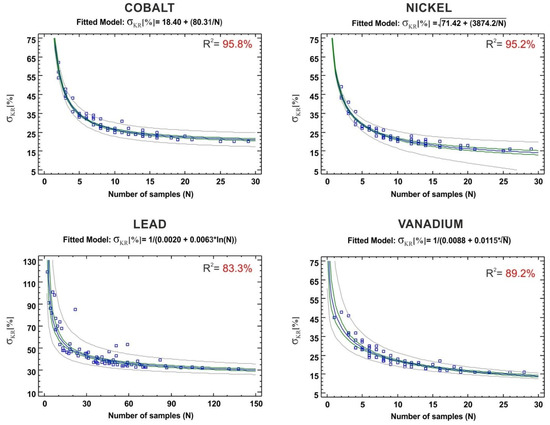Plots of dependence between the relative standard kriging errors (σKR) of the estimated mean abundance of elements and the number of samples in 1 km × 1 km blocks (Explanation: R2—coefficient of determination).