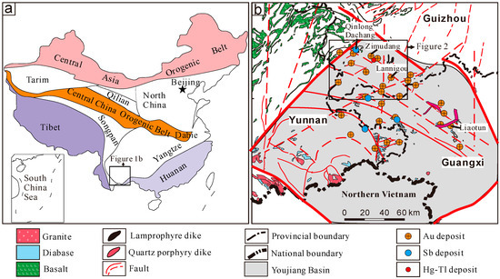 (a) Schematic tectonic map of China showing the location of the Youjiang Basin. (b) Geologic map of the Youjiang Basin showing the locations of the Carlin-type Au, Sb, and Hg-Tl deposits.
