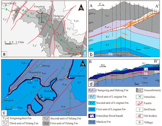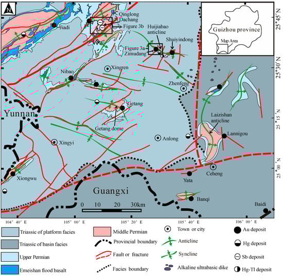 Southwestern Guizhou (Figure 2), situated north of the Youjiang Basin (Figure 1b), contains several super-large or large Au (e.g., Shuiyindong, Lannigou, Zimudang, and Getang) and Sb (e.g., Qinglong and Dachang) deposits. These deposits are thought to have formed during a low-temperature hydrothermal metallogenic event [1,5,17,37], where the Au and Sb orebodies were primarily controlled by short-axis anticlines (domes) and associated fracture zones (Figure 2). The majority of the exposed strata in this region are Devonian to Triassic, with the Triassic system being distributed most widely, which was followed by the Permian, while the Devonian and Carboniferous are sporadically exposed at some cores of anticlines or domes. The magmatic rocks mainly include the Emeishan flood basalts and alkaline ultrabasic pipes and dikes. An unconformity (SBT) between the Middle and Upper Permian, consisting of altered breccia [38], is thought to be the structural conduit that fed ore fluids into the cores of the anticlines (domes) [39]. The Au and Sb mineralization occurs primarily in the SBT and the Upper Permian to Lower Triassic systems.