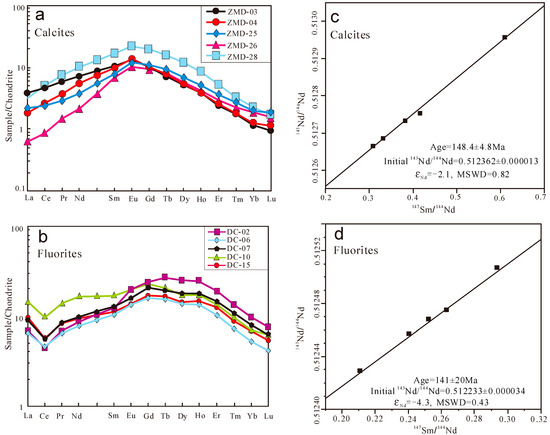 C1 chondrite-normalized [43] rare earth element (REE) patterns (a,b) and corresponding Sm–Nd isochron ages (c,d) of the calcite and fluorite.