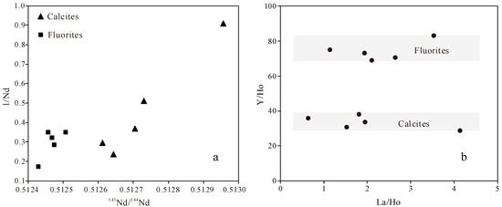 Diagrams of 1/Nd vs. 143Nd/144Nd (a) and Y/Ho vs. La/Ho (b) for the calcite and fluorite.