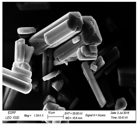 SEM-Micrograph of single crystals of α-FeC2O4 × 2 H2O.