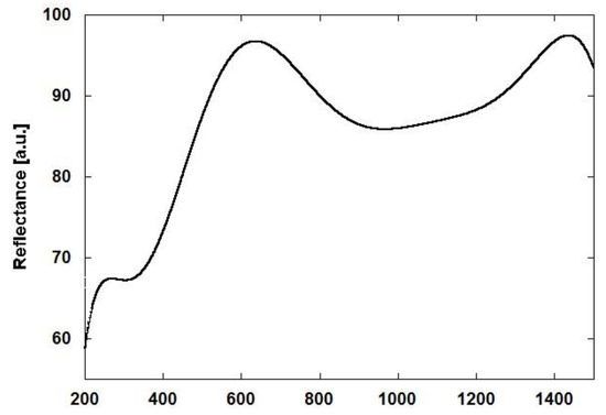 A typical UV/VIS/NIR solid-state reflectance spectrum of synthetic humboldtine is displayed in Figure 2. Contrary to the blueish-green appearance of many simple, divalent iron salts, microcrystalline FeC2O4 × 2 H2O is yellow-brownish, while single crystals are bright yellow. In accordance with the aspect of the solid, the spectrum exhibits an absorption below 250 nm followed by another shallow minimum at 330 nm. These features might be caused by n → π* and π → π* transitions of the resonance-stabilized carbonyl groups. In the absence of detailed spectroscopic investigations, such interpretation is merely speculation. Another shallow, broad absorption feature centered at around 1000 nm might be caused by electronic transitions of the Fe2+ cation in an octahedral crystal field, as observed for other iron(II) containing minerals. The overall appearance of the reflectance spectrum and the observed features are well in line with those reported in previous work [9,37,38].