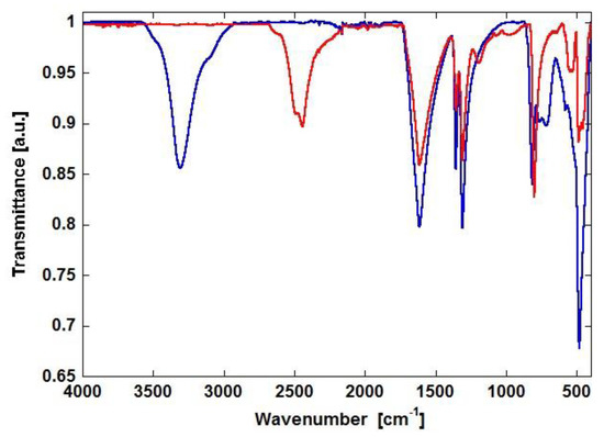 The FT-IR spectra of FeC2O4 × 2 H2O and its deuterated analogue are displayed in Figure 3. Both graphs exhibit the characteristic features expected for a simple metal oxalate [39,40]. The broad band at 3311 cm−1 can be assigned readily to the O-H stretch vibration of structurally coordinated water molecules. The vibrational fine structure reported earlier could not be observed [19,40]. The antisymmetric O-C-O stretch gives rise to another broad and intense signal at 1605 cm−1. The strong absorptions at 1361 and 1313 cm−1 are interpreted tentatively as symmetric elongation of the O-C-O bonds, whereas signals at 822 and 482 cm−1 could originate from C-C deformations and Fe-O stretch vibrations, respectively. A detailed, full analysis of the IR- and Raman-active vibrations of FeC2O4 × 2 H2O has been published [41].