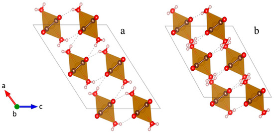 Structural models of iron(II)oxalate dihydrate at 0.1 GPa (a) and 16.7 GPa (b), respectively, viewed along the b-axis. Iron atoms are in the center of the brown shaded octahedron, oxygen atoms are shown in red, carbon atoms in brown, and hydrogen atoms in white. Dashed lines indicate the hydrogen bonds.