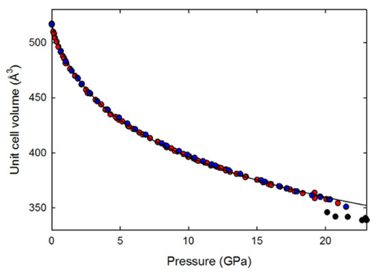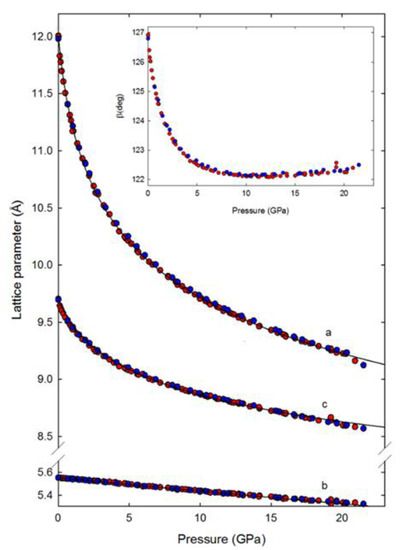 The pressure dependence of the unit cell volume and the lattice parameters are shown in Figure 7 and Figure 8, respectively. The large volume change from 719 Å3 at ambient pressure to around 360 Å3 at p ≤ 20 GPa reflects the high compressibility along the a- and c-axes, while the b-axis shows a much lower, almost linear pressure dependence.