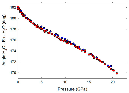 Oblique angle H2O-Fe-OH2 between the oxygen atoms of axial water molecules and the central iron atom of α-FeC2O4 × 2 H2O (red dots) and its deuterated analogue α-FeC2O4 × 2 D2O (blue dots) as a function of pressure.
