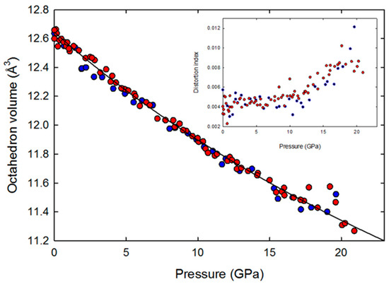 The bulk modulus B0, its derivative at zero pressure B’, and the zero-pressure volume Vo of the lattice parameters and of the octahedron volume as obtained from fitting Equation (3) to experimental data are shown in Table 5.