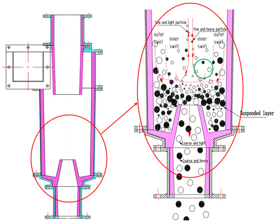 Hydrocyclones are extensively applied as separation and classification machines for grinding-classification. However, the hydrocyclone classification principle [1,2,3,4] can result in a “misclassification” phenomenon (misclassification of fine particles in underflow (UF) and coarse particles in overflow (OF)). When classifying high-concentration, coarse-grained materials, the settling velocity of multi-component particles in swirling flow fields, results in fine particle misclassification in UF, which in turn often causes ore over-grinding that reduces metal recovery and ball mill throughput. Therefore, preventing misclassification in hydrocyclones has become a challenging and active topic for research [5,6,7,8]. In a traditional hydrocyclone, the cylindrical-conical structure determines the main flow field boundary structure and the mechanisms that affect the separation sharpness and classification efficiency [9,10]. The cut size of a traditional cylindrical–conical hydrocyclone is directly proportional to the cone angle [11,12]. Using a traditional cylindrical–conical hydrocyclone for the classification of high-concentration coarse-grained materials results in a small cut size. In the grinding-classification, this small cut size often causes problems, such as an excessive circulating load, increased fine particle misclassification in UF, and easy clogging, which in turn give rise to low classification efficiency of the hydrocyclone, over-grinding of the mill, and a limited increase in the ball mill throughput [13,14,15].