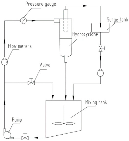 A hydrocyclone separation test system was developed for the determination of the performance of separation in a W-shaped hydrocyclone with Φ75 mm [36]; the structure parameters are shown in Figure 2. The main components of the system, as presented in Figure 3, included a hydrocyclone, a slurry pump, a mixing tank, valves, pipelines, flow meters, pressure gauges, and a frequency converter. In this research, quartz powder (98% purity with a main component of SiO2) was applied for the elimination of the errors generated by the separation effect.