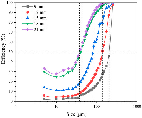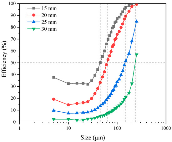 Figure 6 shows the apex diameter effect on the classification efficiency curve. Both the UF split ratio and the yield increased with the apex diameter, resulting in a great number of fine particles mixed into UF [41]. Consequently, recoveries of both fine and coarse particles to UF increased, the cut size decreased, and the efficiency curve shifted leftward.