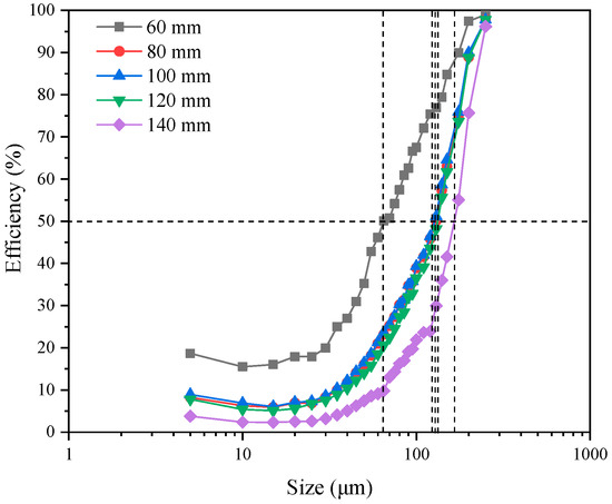 Figure 5 shows the unique effect of vortex finder insertion depth on the classification efficiency curve. The smallest cut size and the highest number of fine particles entering the UF were obtained for a 60 mm insertion depth. The largest cut size was obtained at 140 mm insertion depth, and the recoveries of all particle sizes were very small. Other insertion depths (80 mm, 100 mm, and 120 mm) had little effect on the classification efficiency curve. In general, increasing the insertion depth tended to shift the classification efficiency curve to the right [40].