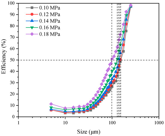 Inlet pressure effect on the indicators of separation performance, such as classification efficiency and product particle size, were evaluated at inlet pressures of 0.10, 0.12, 0.14, 0.16, and 0.18 MPa.