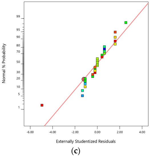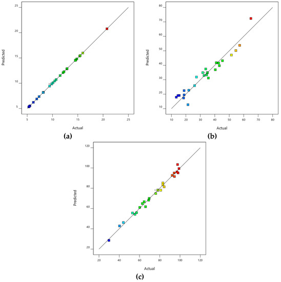 A residual analysis was first performed on the response function models. The results are shown in Figure 8. The distribution of test points was even on both sides of the line and were relatively scattered. The correlation coefficients were R2 = 0.995 (C−25 in UF), R2 = 0.929 (quality efficiency), and R2 = 0.988 (quantity efficiency). These results showed that the model had a high prediction accuracy. Figure 9 revealed a good agreement between the values predicted by the models and the actual experimental results.