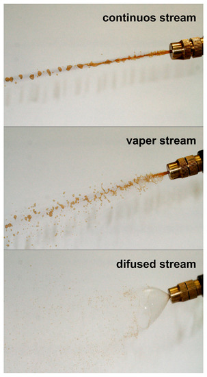 During the experiments, the mixture of raw materials was moistened with a 20% water solution of magnesium lignosulfonate. In order to moisturize, there was 90 g of dry weight lignosuldonate per 1000 g of solution weight. The granulation time was variable and amounted to 6 min for trials 2, 3, 5, 6, 7, 8, 9, 10, and 12 min for trials 1 and 4. During the main tests, the influence of the spray type on the course of the process was also examined, distinguishing between a continuous stream, a dispersed stream, and a mist-Figure 2. After completion of the granule forming process, the granulate obtained was dried at a temperature of 65 °C for 24 h. A sieve analysis was performed using sieves of 1; 2; 3; 4; 5; 6.3; 8; 10; 12.5 mm. The final product, after performing the sieve analysis, was subjected to strength tests.