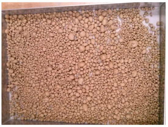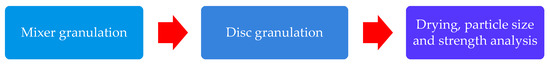 The term non-pressure granulation is understood as the production of solid particles of appropriate shape, dimensions, and physicochemical properties, with an increase in the size of the resulting granules by nucleation [1,2], surrounding granules [3,4], or coalescence [5,6]. Obtaining the desired product including agricultural fertilizers can be done in many different ways and the process itself can be combined with other unit operations. It should be understood that the entire process, especially on an industrial scale, does not consist of only one stage, which is the formation of granules, but is the sum of many technological processes, starting from the preparation of raw materials and ending with the separated finished product. This happens especially when the aim of the process is to produce agricultural fertilizer, the main component of which is a waste material with favorable properties for soil fertilization, e.g., it contains calcium compounds [7], sulfur [8], or organic carbon [9]. Such material usually requires additional technological operations adjusting its properties to the non-pressure agglomeration process. In the case of granular materials, it must have an appropriate granulometric composition, moisture, bulk density, and chemical composition, while it should be remembered that the waste materials used in the granulation process can be either loose materials or those that can be crushed [10,11] and sieved [12,13] to a preferred form, and liquids that serve as binders [14]. Examples of waste bulk materials that can be used in the granulation of agricultural fertilizers are phosphogypsum [15] and sulfogypsum [16], post-saturation mud [17] and ashes resulting from biomass combustion [18], as well as maize straw [19], millet and cane [20], and coal ashes [21]. Non-pressure granulation of mineral materials can be performed in a disc [22], drum [23], in a batch [24], and in continuous operation [25], vibrating [26], mixing [27], in a fluid bed [28,29], as well as in continuous and multi-stage technology, which uses combinations of the above-mentioned devices. Depending on the choice of the process variant, the wetting liquid for the processed bed can be supplied before the granulation process, during the process in the form of one portion [30], or continuously with precisely defined moistening parameters [31].