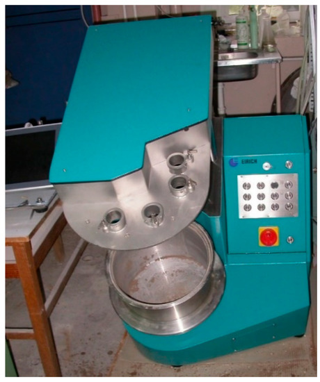 It was assumed that the processed mixture of sulfogypsum and limestone powder would be pre-granulated in an Eirich mixer, which would ensure nucleation of the raw material grains, and then “granulated” in a disc granulator. The operation carried out in the mixer was aimed at greater compaction of the embryos formed (obtained as a result of high inertia forces), while the disc granulation stage led to the appropriate particle size composition and strength. Chronologically, the first step of this method was the mixer granulation. The mixer agglomeration stage was carried out in the Eirich granulator, which we can see in Figure 4. The figure shows a rotating bowl constituting the working chamber of the granulator and the cover to which the stirrer is attached.