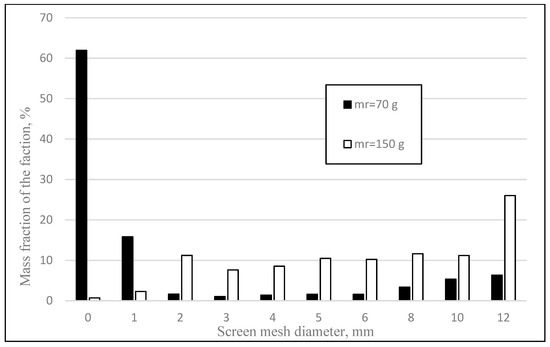 The results of the tests carried out when dispensing liquids with a nozzle producing a micro-droplet vapor in Figure 7 show that when 70 g of solution was used, the fraction of 0–1 mm constituted over 60% of the mass fraction. This proves that the mass of the liquid supplied is too low, which inhibited the process. The comparison of both methods of moistening showed that in the experiment, in which a continuous stream was used for the same mass of solution (70 g), the proportion of non-granulated material after the end of the process was lower by 13.5%. This shows that the punctual delivery of the liquid allowed nucleation, unlike a method where the liquid was delivered evenly.