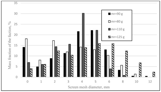 The graphical relationships obtained show that with a small amount of moisturizing liquid (70 g per 1000 g of feed), the mixture of raw materials was not completely granulated. For the tests in which 70 g and 80 g of lignosulfonate solution were used, after the end of the process, a significant share of the 0–1 mm fraction (48% for 70 g and 23% for 80 g) was visible, which was considered non-granular. When 100 or 125 g of the solution is delivered to the bed, it can be seen that ungranulated or abraded material (0–1 mm fraction) is only 1% for 125 g and 6% for 100 g of solution. The experiment in which 100 g of lignosulfonate solution was injected into the bed was considered as the test in which the most favorable particle size distribution of the product was obtained. It is characterized by a low mass of non-granulated material and over 73% share of 1–10 mm fractions. By dosing the binder with a continuous stream, it is very easy to obtain local moistening of the raw material. This results in the possibility of wet material sticking together and a high probability of the formation of granules with an equivalent diameter above 10 mm, which are oversized in the production of fertilizer. This happens all the more when the continuous stream of liquid collides directly with the material being processed. In order to counteract such a phenomenon, the liquid should be supplied from an appropriate height and pressure that will break the continuous stream (the stream may break just above the bed) into drops with an equivalent diameter of approximately 2–3 mm [48,49].