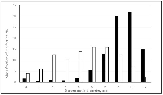 The analysis of the results presented in Figure 12 shows that granulation with moistening of the gypsum-lime mixture with molasses allows more favorable particle size compositions of the obtained products to be obtained than tests with the use of lignosulfonate. During granulation, which differed only in the moisturizing liquid used, a product was obtained in which there were almost no granules above 10 mm, and the sub-grain size was from 4% to 9%. The research conducted has shown that in the case of moistening with 20% magnesium lignosulfonate solution, in order to obtain a favorable particle size distribution, the granulation time should be extended. The comparison of granulation tests with the use of both liquids for different granulation times (tests with molasses 12 min, tests with lignosulfonate 6 min) is shown in Figure 13.