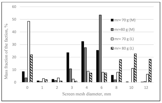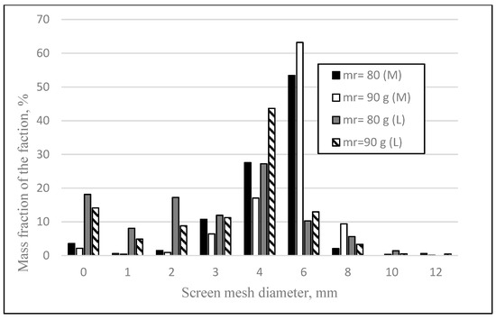 Comparison of the mass fractions of the granulate obtained for tests carried out during moistening with molasses (M) and magnesium lignosulfonate (L) (granulation time, tg = 12 min), (mr–mass of the solution).