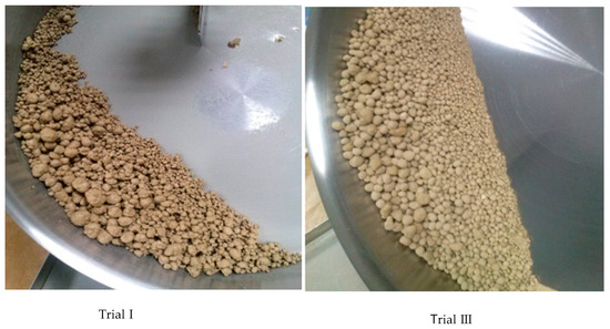 In order to eliminate the disadvantages of one-step granulation, it was decided to carry out two-step granulation trials. One thousand grams of limestone powder and 1000 g of waste gypsum were used to carry out the two-stage granulation tests. A 20% magnesium lignosulfonate solution was used as the binder liquid. The bowls and the stirrer rotated at a peripheral speed of 0.7 m/s and 2.4 m/s, respectively. The ingredients were added into the bowl of the mixer granulator and then mixed for 60 s to equalize the compositions.