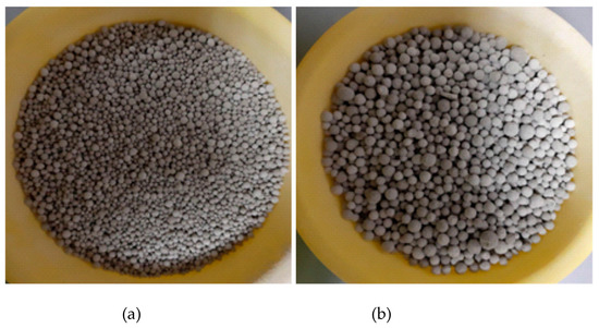 The granulate obtained divided into fractions of 1–4 mm and 4–8 mm, shown in Figure 18. During granulation on an industrial scale, comparable results for granulation on a laboratory scale were obtained. The product obtained is of high strength and granulometric composition, in which the total weight of undersize and oversize is less than 10% of the total weight of the product. The concept of two-stage granulation of gypsum-lime fertilizer using liquids such as molasses or magnesium lignosulfonate has been positively verified on an industrial scale.