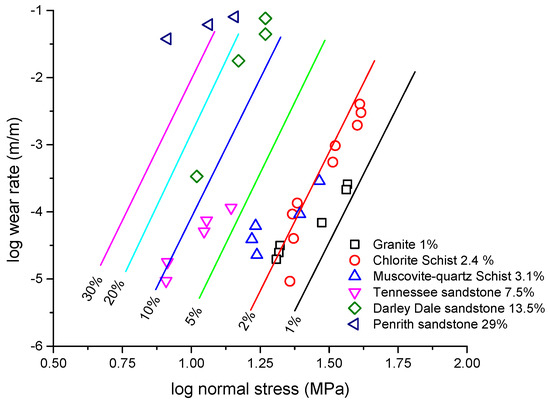 Plot of wear rate versus normal stress for various types of rock samples of different porosities [