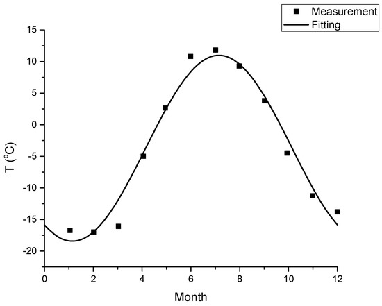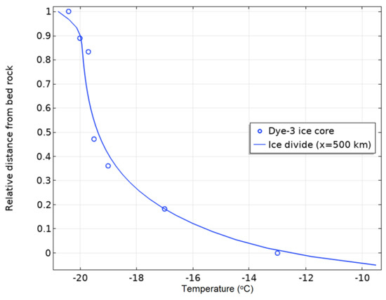Temperature profile at the ice divide (solid line is the modeling results, and scattered circles are the measurements).