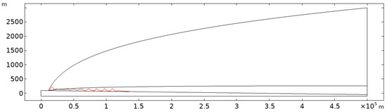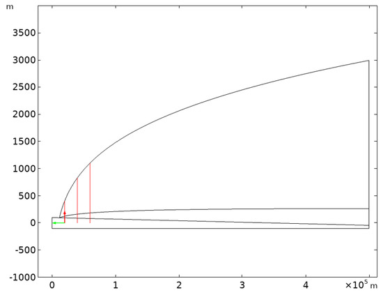 Cross-section of the ice sheet model, with vertical boreholes highlighted in red that are compared with available monitoring data. The horizontal axis is directed towards the ridge divide, while the vertical axis indicates elevation. The three red vertical lines are respectively located at 20, 40, and 60 km from the edge.