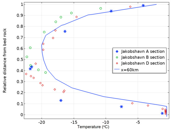 Comparison of modeling results with temperature profile at Jakobshavn Glacier.