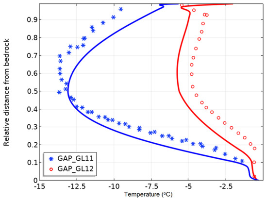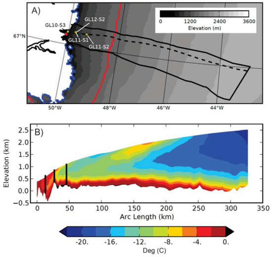 Modeled ice temperature field (this study) along a transect through the GAP area.