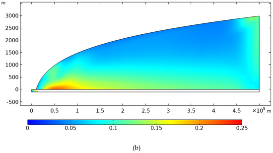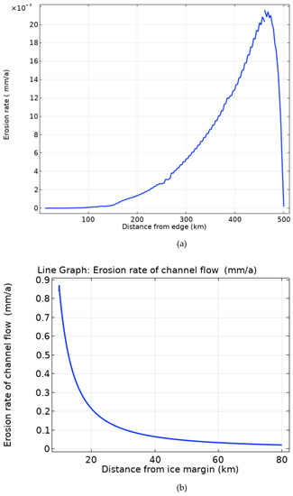 Distribution of the transient abrasion erosion rate at the base (a), and the erosion rate of subglacial meltwater flow (b) along the ice sheet flowline inward the ice divide. The average abrasion erosion rate Er = 5.7 × 10−3 mm/a and the average meltwater erosion rate EM = 0.12 mm/a.