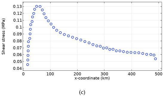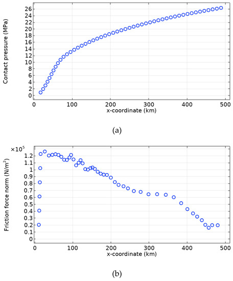 Distribution of contact normal stress (a), friction force norm (b), and shear stress (c) upon the ice sheet/bedrock interface.