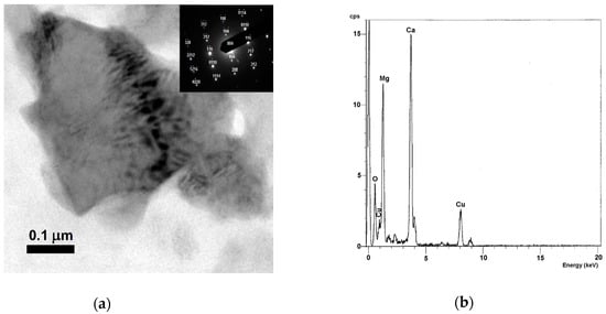(a) TEM image, SAED pattern, and (b) EDS spectrum of Mg-calcite crystal from RLL tissue of a 30-year-old male smoker.