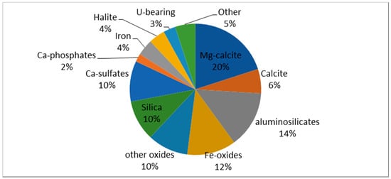 Most of the constituents of ambient atmospheric dust in the USC are anthropogenic, including rock-forming minerals that may have been released during mineral processing or construction [32]. Major airborne dust phases include: quartz (>20 vol. %), soot (<10 vol. % in summer and up to 90 vol. % in winter), fly-ash (20 vol. % throughout the year), gypsum (20 vol. % in winter), and Fe-oxides (hematite, magnetite, wüstite). In addition to the major constituents, over 30 minor- or accessory mineral phases have been identified in atmospheric dust samples in the USC [32,33,34].