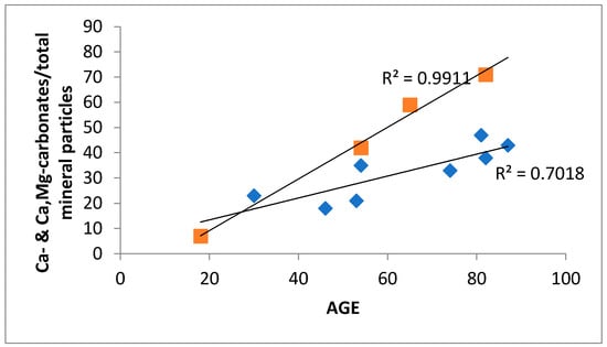 Ratio of carbonates to the total amount of mineral particles in RLL tissues of 12 individuals from the USC vs. their age (squares—females; diamonds—males).