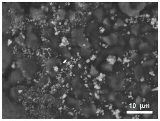 SEM image of Mg-calcite and calcite incrustations (bright grains) on RLL tissues of an 81-year-old former miner and life-long smoker.