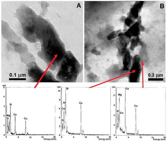 TEM images and related EDX spectra of Mg-calcite-coated: (A) silica and (B) aluminosilicate particles deposited in RLL of individuals from the USC.
