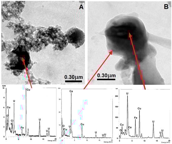 Of particular interest was the observation of uranium oxide (perhaps, uraninite) and Fe-rich particles coated by ACC (Figure 6), suggested by the diffuse halos in the SAED patterns. Uranium-bearing particles, often associated with soot, have been observed in airborne mineral dust samples collected at several sites in the USC (Figure 6A). Their occurrence resembles uraninite nanocrystals encapsulated in carbonaceous matter in suspended particulates released from coal-fired power plants in Detroit, Michigan [40]. Thus, it is no surprise to find uranium-bearing particles in the lungs of people living in places affected by coal combustion. The strong Fe peak in the EDX spectrum of a U-bearing particle in lung tissue may reflect Fe-bearing phase/phases either associated with the inhaled U-bearing particle (Figure 6A) or may have originated in the process of phagocytosis [41].