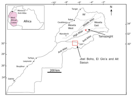 52. Gasquet, D.; Levresse, G.; Cheilletz, A.; Azizi-Samir, M.R.; Mouttaqi, A. Contribution to a geodynamic reconstruction of the An-ti-Atlas (Morocco) during Pan-African times with the emphasis on inversion tectonics and metallogenic activity at the Pre-cambrian–Cambrian transition. Precambrian Res. 2005, 140, 157–182. [Google Scholar] [CrossRef]