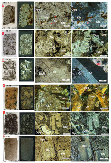 All samples from the Tamazight alkaline complex occurred as coarse-grained syenites, displaying post-magmatic fractures and alteration (Figure 2). The sample TS14 contained mainly euhedral to subhedral K-feldspar crystals (orthoclase: up to 60 vol.% of the rock) up to 1 cm in size, which were slightly altered and fractured. It was also composed of a greyish destabilized mineral phase (up to 25–30 vol.%) (old feldspathoids, e.g., relict nepheline) that was completely transformed to clay minerals. Albite, titanite, quartz, ferri-sodic pyroxene, carbonates, garnet, Fe-Ti oxides, apatite, and zircon were the main accessory minerals. Compared to TS14, TS01 and TS10 were strongly altered syenites in which all ferromagnesian minerals (e.g., pyroxene, biotite) were replaced by Fe-oxides. Subhedral to anhedral crystals of K-feldspar (orthoclase and microcline) were abundant and reached 50–60 vol.% of the rock. These K-bearing minerals were strongly sericitized and kaolinized. Nepheline, biotite, plagioclase, quartz, carbonates, titanite, garnet, Fe-Ti oxides, apatite, and zircon were also present.