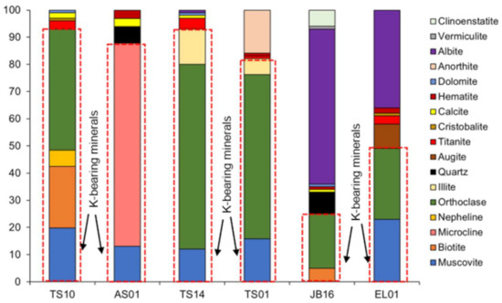 The mineralogical composition of the studied samples is presented in Figure 4 (XRD patterns are shown in supplementary materials, Figures S1–S6). The studied samples were composed mainly of orthoclase, microcline, albite, muscovite, biotite, and anorthite, which confirmed the results of the petrographic observations (Figure 2). Based on the profile fitting method, quantitatively the orthoclase content ranged between 20 wt% for JB16 and 68 wt% for TS14. Microcline was only detected in the AS01 sample and account for 74 wt% of the rock. Muscovite was found in all samples and ranged from 12 wt% for TS14 to 23 wt% for EL01, whereas albite represented the major phase in JB16 and EL01. Moreover, titanite, cristobalite, dolomite, and calcite were detected in minor amounts.