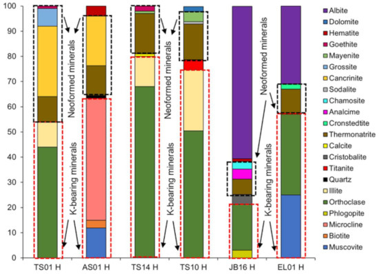 The mineralogical composition of the hydrothermally treated rocks is presented in Figure 5. Potassic feldspar (orthoclase, microcline) and sodic feldspar (albite) remained the main phases within the treated samples. However, each sample presented the same new mineral in different proportions: sodium carbonate, called thermonatrite (Na2CO3H2O), whereas zeolites (analcime and sodalite) were detected as a minor phase in JB16H and TS10H. Cancrinite represented a significant constituent of AS01H. Additionally, minor products such as chamosite and cronstedtite resulting from hydrothermal alteration of pyroxene, amphibole, and biotite were found in JB16H and EL01H. Other products such as mayenite and grossite were found in TS10H, TS14H, and TS01H.