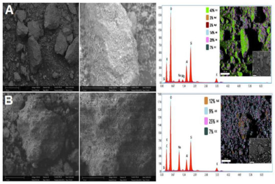 Figure 7. SEM-EDS of the treated materials indicating their elemental distribution: (A) EL01 and (B) EL01H observed at 100 µm and 40 µm. (K: potassium, Si: Silicium, Na: Sodium, Mg: Magnesium, Al: Aluminium and O: Oxygen).