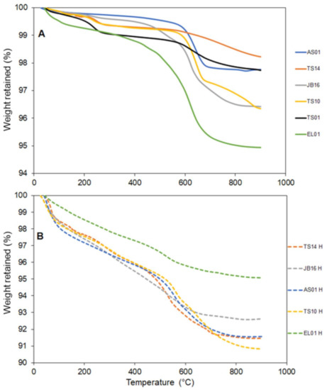 Figure 9. Thermal gravimetric analyses (TGA) of TS01, TS10, TS14, JB06, AS01, and EL01 samples (A) and their hydrothermal equivalent (B) from room temperature to 900 °C.