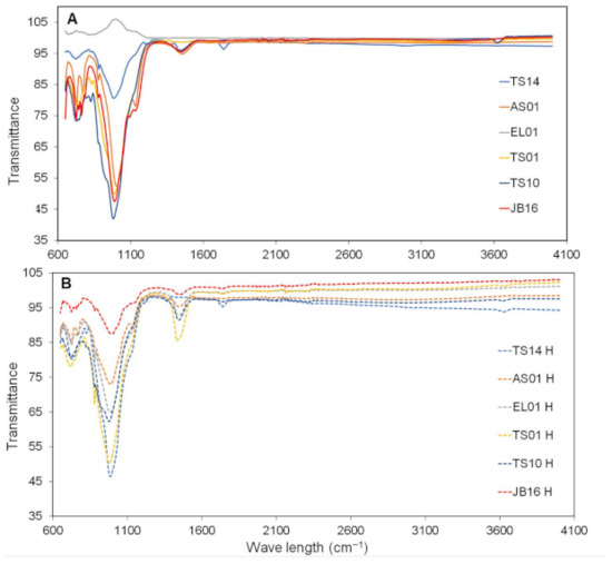 The structural analysis of raw and hydrothermal material done by XRD and TGA was further complemented by detailed FTIR analysis. Spectra of the raw sample powders (TS01, TS10, TS14, JB16, AS01, EL01) and their corresponding treated samples in the wavenumber range of 650–4000 cm−1 are shown in Figure 10. As the samples presented almost the same behavior and deformations occurred at a different wavelength, absorption bands were observed at 727, 1050, 1456, and 1742 cm−1 and were assigned as follows: The bands 727 and 1050 cm−1 were assigned to Si-(Al)Si and Si(Al)-O stretching vibrations, respectively, and 1742 cm−1 bands were attributed to the H-O-H bending mode of molecular water (zeolite water). Blanco (1989), Kanepit (1995), and Brittaposnatzki (2003) [58,59,60] associated this band with the bending vibrations of oxonium ions H3O+ in the cancrinite. Compared to the raw material, the hydrothermal samples exhibited strong peaks at band 1456 cm−1, which can be attributed to the stretching vibration of C=O [61]. The absorption band at 1456 cm−1 in treated material could be attributed to the change in mineral structure and the embedding of NaOH. These results confirm the presence of carbonate groups and are in agreement with the XRD results showing the presence of a thermonatrite phase.