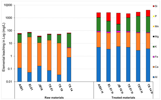 The leaching of each sample (mg/L) is graphically displayed in Figure 11 (data in Table S1, Supplementary Materials). The macronutrients released, including Ca, Mg, K, and Si are higher for the treated samples than for the raw samples. The treated material also exhibits the release of Fe, P, and Al in low proportions. Potassium and silicon are the most released elements by the hydrothermal treatments. Quantitatively, raw material shows a Si and K release of about 8.2, 7, 4.6, 5.4, 5.5, and 6.2 (mg/L), and 40.7, 33.3, 20.7, 30.7, 36.7, and 55.3 (mg/L) for AS01, EL01, JB16, TS01, TS10, and TS14, respectively. Concerning the treated samples, Si and K concentrations are about 1483.1, 2018, 2048.1, 1119.6, 1473, and 2759.6 (mg/L) and 959.4, 469.5, 218.6, 932.3, 1278.5, and 1206.5 (mg/L) for AS01H, EL01H, JB16H, TS01H, TS10H, and TS14H, respectively.